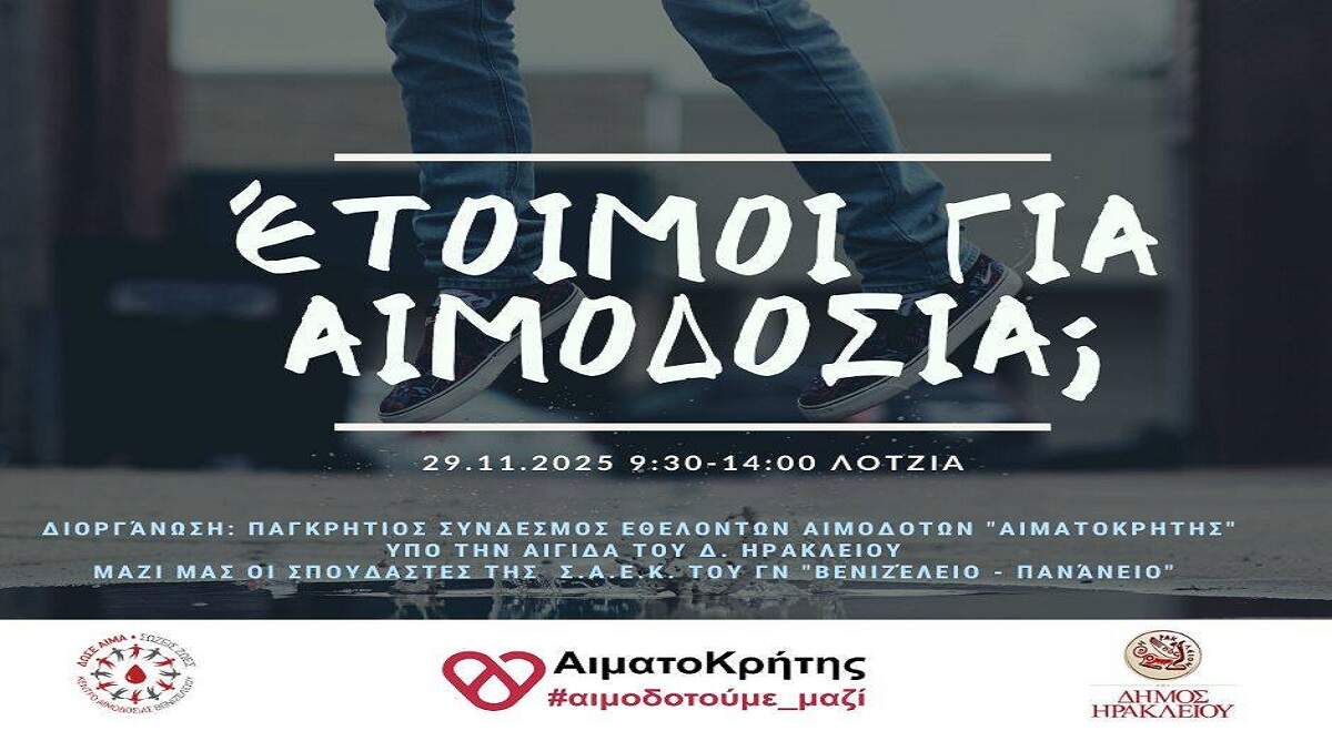 Πρόκειται για μια κοινή προσπάθεια αιμοδοσίας, την οποία διοργανώνει ο Παγκρήτιος Σύνδεσμος Εθελοντών Αιμοδοτών και Δωρητών Οργάνων Σώματος «Αιματοκρήτης» με τη στήριξη του Δήμου Ηρακλείου.
