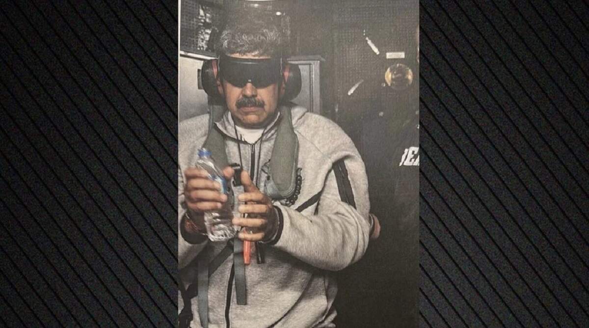 Ο Μαδούρο είναι επάνω στο αμερικανικό αεροπλανοφόρο Iwo Jima, φοράει γκρι φόρμα και έχει τόσο τα μάτια όσο και τα αυτιά του καλυμμένα. Τα χέρια του είναι δεμένα και με δυσκολία κρατάει ένα μπουκάλι νερό.