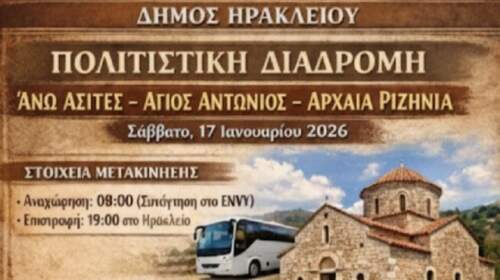 Επίσκεψη στο φαράγγι των Ασιτών, ξενάγηση στα Σιδερόσπηλια και στην Αρχαία Ριζηνία Μια ενδιαφέρουσα πολιτιστική διαδρομή στο χωριό Άνω Ασίτες διοργανώνει η Αντιδημαρχία Εθελοντισμού του Δήμου Ηρακλείου σε συνεργασία με την εθελοντική ομάδα «Φιλόπολις» το Σάββατο 17 Ιανουαρίου με αφορμή την γιορτή του Αγίου Αντωνίου.Το πρόγραμμα της πολιτιστικής διαδρομής περιλαμβάνει επίσκεψη στο φαράγγι του Αγίου Αντωνίου, με το φερώνυμο εκκλησάκι…
