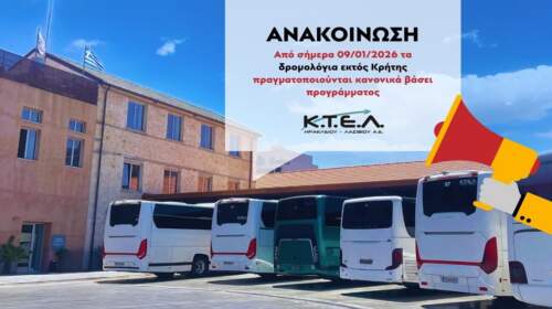 Η ΚΤΕΛ Ηρακλείου Λασιθίου ενημερώνει το επιβατικό κοινό ότι από σήμερα, 09/01/2026, τα δρομολόγια εκτός Κρήτης πραγματοποιούνται κανονικά, βάσει προγράμματος, μετά τις τελευταίες εξελίξεις που αφορούν τις αγροτικές κινητοποιήσεις. Τα δρομολόγια πραγματοποιούνται κανονικά προς τους παρακάτω προορισμούς:Λαμία, Λάρισα, Κατερίνη, Θεσσαλονίκη, Κόρινθο, Πάτρα, Μεσολόγγι, Αγρίνιο, Άρτα και Ιωάννινα. Οι επιβάτες μπορούν να ενημερώνονται αναλυτικά για το πρόγραμμα των δρομολογίων μέσω της επίσημης…