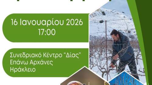 Mε την υποστήριξη της Περιφέρειας Κρήτης στις Αρχάνες Εσπερίδα με θέμα την Αμπελουργία διοργανώνει το Δίκτυο Οινοποιών Κρήτης, με την υποστήριξη της Περιφέρειας Κρήτης, την Παρασκευή 16 Ιανουαρίου 2026 στις 17:00, στο Συνεδριακό Κέντρο «Δίας» στις Αρχάνες Ηρακλείου. Στόχος της εκδήλωσης είναι η ενίσχυση της γνώσης, η ενημέρωση και η στήριξη των αμπελουργών και των επαγγελματιών του κλάδου γύρω από σύγχρονα και κρίσιμα…