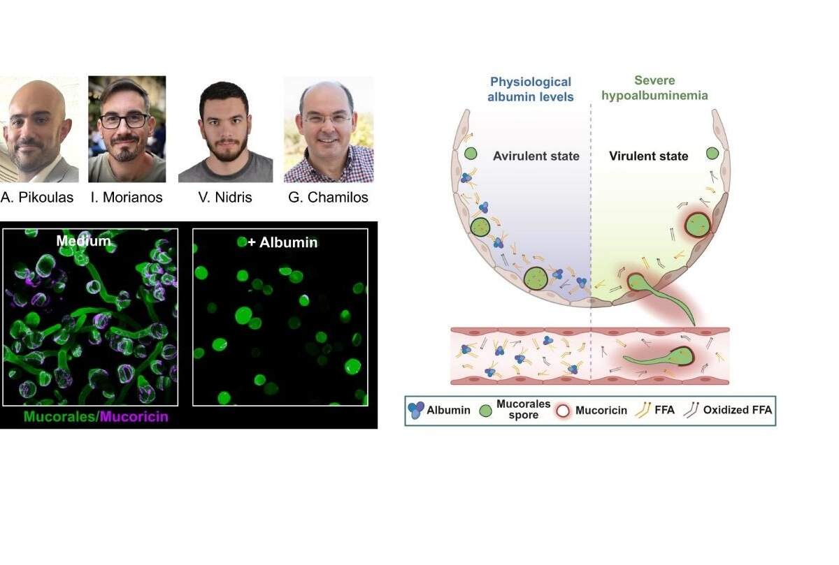 Πάνω, από αριστερά, οι κύριοι ερευνητές που συμμετείχαν στην εργασία, Αντώνης Πίκουλας, Γιάννης Μοριανός, Βασίλης Νιδρής και ο επικεφαλής της εργασίας καθ. Γιώργος Χαμηλός. Κάτω αριστερά απεικονίζονται σπόρια των μυκήτων της οικογένειας Mucorales (πράσινο) τα οποία αναπτύσσονται και παράγουν την τοξίνη Μουκορικόνη (Mycoricin) (μωβ). Παρουσία αλβουμίνης, αναστέλλεται επιλεκτικά η ανάπτυξη των σπορίων και η τοξίνη δεν εκκρίνεται. Στα δεξιά παρουσιάζεται ο μηχανισμός δράσης της αλβουμίνης.Η αλβουμίνη σε φυσιολογικά επίπεδα δεσμεύει τα ελεύθερα λιπαρά οξέα (FFA) και τα προστατεύει από την οξείδωση. Εκείνα στη συνέχεια εισέρχονται στα σπόρια του μύκητα (Mucorales spores) και εμποδίζουν την ενεργοποίηση γονιδίων σημαντικών για την ανάπτυξή τους. Σε περιπτώσεις σοβαρής υποαλβουμιναιμίας, τα ελεύθερα λιπαρά οξέα οξειδώνονται (oxidized FFAs),οι μύκητες αναπτύσσονται, παράγουν Μουκορικόνη (Mucoricin) και προκαλούν λοίμωξη.