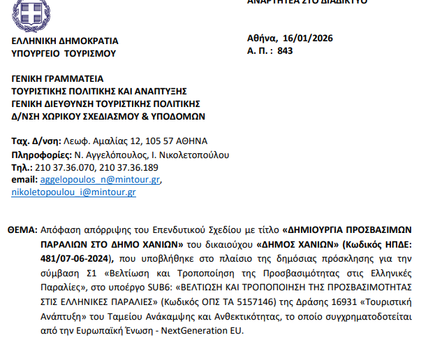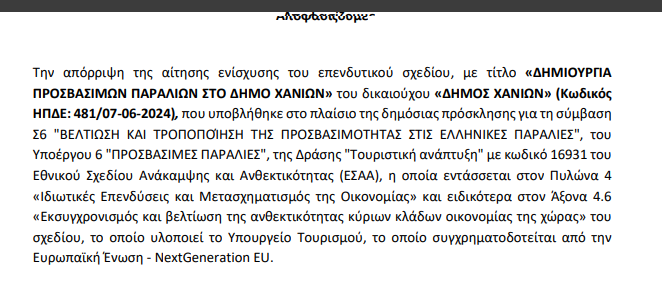 Χαρακτηριστικά αναφέρεται ότι το υπουργείο αποφσίζει “την απόρριψη της αίτησης ενίσχυσης του επενδυτικού σχεδίου, με τίτλο «ΔΗΜΙΟΥΡΓΙΑ ΠΡΟΣΒΑΣΙΜΩΝ ΠΑΡΑΛΙΩΝ ΣΤΟ ΔΗΜΟ ΧΑΝΙΩΝ» του δικαιούχου «ΔΗΜΟΣ ΧΑΝΙΩΝ» (Κωδικός
