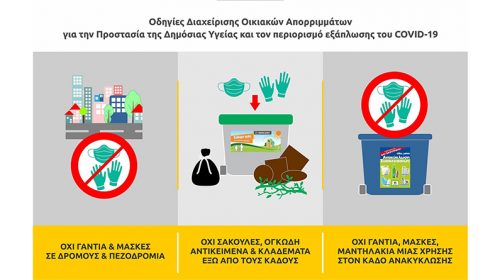 H Διεύθυνση Καθαριότητας και Ανακύκλωσης του Δήμου Μαλεβιζίου ενημερώνει τους δημότες ότι για την προστασία της δημόσιας υγείας και τον περιορισμό της εξάπλωσης του COVID-19 είναι κρίσιμο να ακολουθούνται οι οδηγίες διαχείρισης των οικιακών τους απορριμμάτων, σύμφωνα και με τις οδηγίες της Γενικής Γραμματείας Διαχείρισης Αποβλήτων του Υπουργείου Περιβάλλοντος και Ενέργειας. · Γάντια, μάσκες, μαντηλάκια μιας χρήσης: Ø ΟΧΙ στους δρόμους και τα πεζοδρόμια. Ø ΟΧΙ στους μπλε…