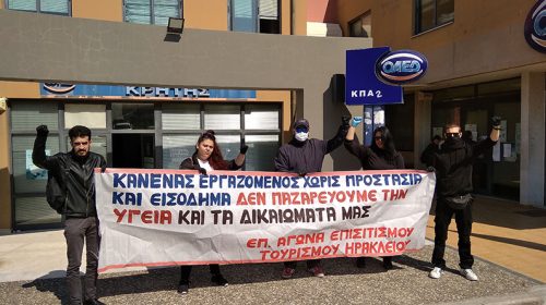 Στα πλαίσια της μέρας δράσης στον ΟΑΕΔ που γίνεται με πρωτοβουλία σωματείων και φορέων του κλάδου από όλη την Κρήτη, η Επιτροπή Αγώνα Εργαζομένων στον Επισιτισμό – Τουρισμό Ηρακλείου πραγματοποίησε παρέμβαση στην Περιφερειακή Διεύθυνση Κρήτης του ΟΑΕΔ. Κατατέθηκε στον Περιφερειακό Διευθυντή του ΟΑΕΔ το υπόμνημα που συνυπογράφεται από την Επιτροπή Αγώνα και 43 κλαδικά και επιχειρησιακά σωματεία από όλη την…