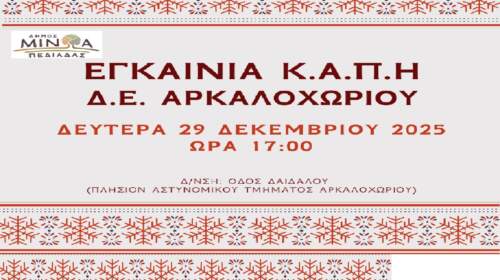 Τη Δευτέρα 29 Δεκεμβρίου 2025 στις 17:00, τα εγκαίνια του Κ.Α.Π.Η. Αρκαλοχωρίου που επαναλειτουργεί σε νέο χώρο μετά το σεισμό του 2021- Οι δράσεις που δρομολογούνται για τα άτομα της Τρίτης ΗλικίαςΟ Δήμος Μινώα Πεδιάδας ανακοινώνει ότι τη Δευτέρα 29 Δεκεμβρίου 2025 και ώρα 17:00, θα πραγματοποιηθούν τα εγκαίνια του νέου κτιρίου ΚΑΠΗ Αρκαλοχωρίου.Το ΚΑΠΗ που επαναλειτουργεί σε νέο χώρο…