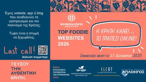 Λήγει στις 31 Δεκεμβρίου η προθεσμία συμμετοχής στον διεθνή διαγωνισμό TOP FOODIE WEBSITES 2026 για την ανάδειξη της κρητικής γαστρονομίας Η Κρήτη, Ευρωπαϊκή Περιφέρεια Γαστρονομίας 2026, ανοίγει την ψηφιακή της κουζίνα στον κόσμο και καλεί δημιουργούς, επαγγελματίες και φορείς να πάρουν θέση στο διεθνές… τραπέζι του διαγωνισμού TOP FOODIE WEBSITES 2026.Ο διαγωνισμός απευθύνεται σε websites, εφαρμογές, blogs ή άλλο ψηφιακό εργαλείο…