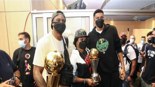 Με το βαρύτιμο τρόπαιο του NBA στα χέρια προσγειώθηκε στην Ελλάδα και στο «Ελευθέριος Βενιζέλος» ο Γιάννης Αντετοκούνμπο, μαζί με τον αδερφό του, Θανάση. Οι δύο πρωταθλητές του NBA με τους Μιλγουόκι Μπακς προσγειώθηκαν στη χώρα μας λίγο μετά τις 11 το πρωί της Κυριακής, ενώ συνοδεύονταν από τα μέλη της οικογένειάς τους, μεταξύ των οποίων κι η μητέρα τους,…