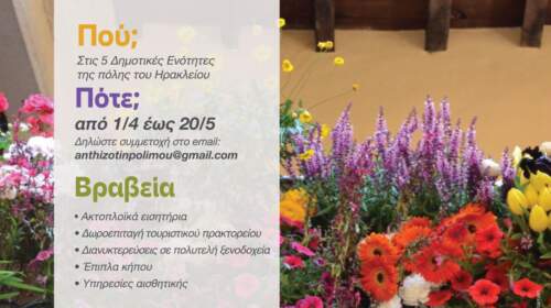 Θα βραβευτούν τα τρία καλύτερα από κάθε κατηγορία Η Ομάδα Ποιότητας Ζωής και Περιβάλλοντος των Εθελοντών της Παράταξης «Δικαίωμα στην Πόλη» διοργανώνει διαγωνισμό καλλωπισμού μπαλκονιού, κήπου, ταράτσας με τίτλο «ΑνθίΖΩ την πόλη μου». Οι Εθελοντές της Παράταξης επιδιώκουν η περιβαλλοντική αυτή γιορτή να γίνει θεσμός και αφορμή ώστε να μπει ξανά η φύση στην καθημερινότητα μας. Καλούν τους πολίτες του…