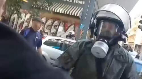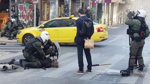 «Ένας άνδρας των ΜΑΤ πατάει το λαιμό ενός, πεσμένου στο έδαφος, διαδηλωτή. Στέκομαι από πάνω του και όταν βλέπω να μην κουνιέται ο διαδηλωτής λέω στον ΜΑΤατζή “μήπως να μην του πατάτε το λαιμό μην έχουμε κανένα ”ατύχημα”. Αμέσως παίρνει το πόδι του» – Μάλιστα, καταγγέλλει ότι άνδρας των ΜΑΤ έσπασε τη τζαμαρία ενός φωτοτυπικού μαγαζιού και όχι διαδηλωτής Σε μια σοβαρή…