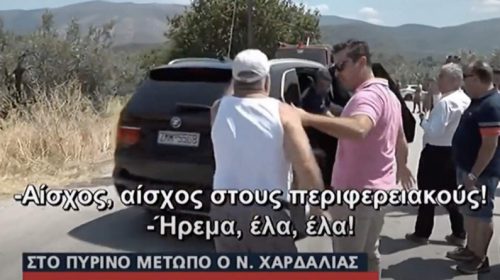 Πριστατικό μεταξύ πολίτη και του υφυπουργού Πολιτικής Προστασίας Νίκου Χαρδαλιά σημειώθηκε σήμερα στις Κεχριές Κορίνθου, όπου μαίνεται καταστροφική πυρκαγιά.  Ο Νίκος Χαρδαλιάς έφτασε στην περιοχή για τον συντονισμό της κατάσβεσης.  Βίντεο που ήρθε στη δημοσιότητα τον δείχνει να βγαίνει από το όχημα στο οποίο επέβαινε και να απαντά σε κάποιον που ζητούσε «ένα ακόμα αεροπλάνο» ότι «αυτή τη στιγμή η διαχείριση γίνεται όπως…