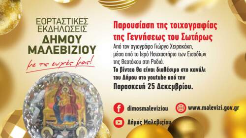 Στο κανάλι του Δήμου Μαλεβιζίου στο YouTube Μια ακόμη διαδικτυακή δράση του Δήμου Μαλεβιζίου μπορείτε να παρακολουθήσετε στο κανάλι του Δήμου στο YouTube. Πρόκειται για διαδικτυακή ξενάγηση στην τοιχογραφία της «Γεννήσεως του Σωτήρος» στο Ιερό Ησυχαστήριο των Εισοδίων Της Θεοτόκου της Ροδιάς. Ο αγιογράφος Γεώργιος Εμ. Χειρακάκης από το Ιερό Ησυχαστήριο των Εισοδίων Της Θεοτόκου της Ροδιάς Μαλεβιζίου, μας ξεναγεί στην τοιχογραφία της “Γεννήσεως του Σωτήρως”, θρησκευτική παράσταση ιδιαίτερης…