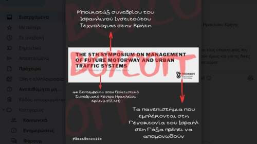 Η Παλαιστινιακή Εκστρατεία για το Ακαδημαϊκό και Πολιτιστικό Μποϊκοτάζτου Ισραήλ (PACBI) καλεί να μποϊκοτάρουμε το «5ο Συμπόσιο για τηΔιαχείριση Μελλοντικών Συστημάτων Αυτοκινητοδρόμων και ΑστικήςΚυκλοφορίας» Τρεις μήνες τώρα, έχουμε πληροφορηθεί μέσω του BDS ότι 4-6 Σεπτεμβρίου2024,θα πραγματοποιηθεί στο κτήριο του Πολιτιστικού Κέντρου του ΔήμουΗρακλείου Κρήτης, ένα συνέδριο το οποίο αναδεικνύει την έρευνα στουςτομείς της τεχνητής νοημοσύνης, της καθοδήγησης οχημάτων και τουτηλεχειρισμού…