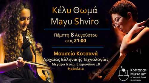 Tο νέο Mουσείο Αρχαίας Ελληνικής Τεχνολογίας Κώστα Κοτσανά στο Ηράκλειο Κρήτης θα φιλοξενήσει τη Πέμπτη 08 Αυγούστου 2019, στις 21.00 το μουσικό ντουέτο Κέλυ Θωμά και Mayu Shviro. Η Κέλυ Θωμά και η Mayu Shviro γνωρίστηκαν στο Μουσικό Εργαστήρι Λαβύρινθος στην Κρήτη και συνεργάζονται από το 2016. Μαζί θα μας παρουσιάσουν ένα πρόγραμμα από σύγχρονες τροπικές συνθέσεις της Κέλυς Θωμά…