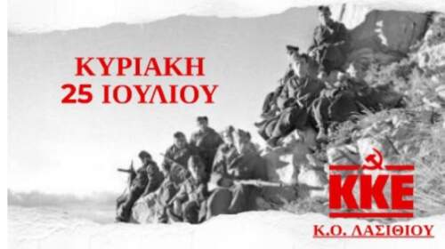 Εκδήλωση τιμής και μνήμης θα πραγματοποιήσει η ΚΟ Λασιθίου την Κυριακή 25 Ιουλίου, 12:00 στην θέση «Σκοτεινά Λακκάκια», 10 χιλιόμετρα μετά την Κριτσά στον Άγιο Νικόλαο, για την συγκρότηση της αντάρτικης ομάδας του Τμήματος Ανατολικής Κρήτης του ΔΣΕ το 1947. Θα μιλήσει ο Σίμος Συμεωνίδης, μέλος της Επιτροπής Περιοχής Κρήτης του ΚΚΕ, στο σημείο που το κόμμα έχει τοποθετήσει μνημείο…