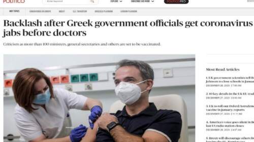 Στην σκληρή κριτική που δέχεται η κυβέρνηση Μητσοτάκη για την επιλογή της πάνω από 100 κυβερνητικά στελέχη, υπουργοί, υφυπουργοί, γενικοί γραμματείς και άλλοι, όχι απλώς να περιληφθούν στην πρώτη φάση εμβολιασμού αλλά κυρίως να είναι από τους απολύτως πρώτους που έκαναν το εμβόλιο, ακόμη και «αντικαθιστώντας» γιατρούς και νοσηλευτές που δίνουν τη μάχη καθημερινά στην πρώτη γραμμή στα ίδια κεντρικά νοσοκομεία όπου…