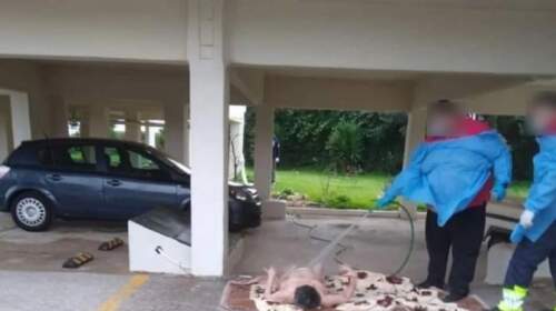 Aδιανόητες εικόνες στον Ωρωπό: Πλήρωμα ασθενοφόρου πλένει με λάστιχο γυμνή ηλικιωμένη γυναίκα σε πυλωτή