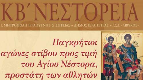 Η Ιερά Μητρόπολη Ιεραπύτνης και Σητείας σε συνεργασία με τον Δήμο Ιεράπετρας και τον Γυμναστικό Σύλλογο «ΛΙΒΥΚΟΣ» διοργανώνουν και φέτος αγώνες στίβου, τα «ΚΒ΄ ΝΕΣΤΟΡΕΙΑ», προς τιμήν του Αγίου Μάρτυρος Νέστορος, προστάτη των αθλητών. Οι αγώνες έχουν παγκρήτιο χαρακτήρα και θα διεξαχθούν την Κυριακή 27 Οκτωβρίου 2024, ημέρα μνήμης του Αγίου Μάρτυρος Νέστορος, και ώρα 4:30΄ μ.μ., στο Παραλιακό Δημοτικό…