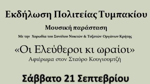 Η Πoλιτεία Τυμπακίου καλεί στην μουσική παράσταση με τίτλο «Οι Ελεύθεροι κι Ωραίοι» Αφιέρωμα στον Σταύρο Κουγιουμτζή από την χορωδία του συνόλου Νυκτών και Τοξοτών Οργάνων Κρήτης που θα πραγματοποιηθεί το Σάββατο 21 Σεπτεμβρίου 2024 και ώρα 20:00, στον προαύλιο χώρο του Ι.Ν. Αγίου Πνεύματος Τυμπακίου. Καλλιτεχνική Επιμέλεια – Διεύθυνση Μιχαήλ Ε. Μαρακομιχελάκης. Ομιλητής για το Μαρτυρικό Τυμπάκι θα είναι…