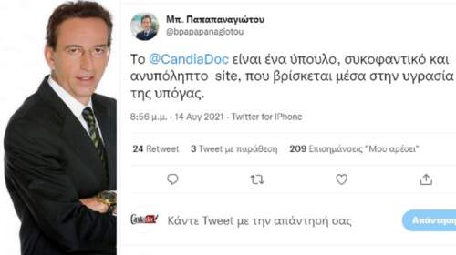 Ενημερωθήκαμε καθυστερημένα, γιατί δε γίνεται να παρακολουθούμε και όλους αυτούς τους τύπους που περιφέρονται στην αυλή του Μητσοτάκη. Ο γνωστός “αστέρας”, κάποτε σύμβουλος του, Μπάμπης Παπαπαναγιώτου, που αν παρακολουθήσετε τις παρεμβάσεις του στα κοινωνικά δίκτυα θα διαπιστώσετε τι μπόχα βγαίνει από το στόμα του, τα ΄έβαλε με αισχρό τρόπο με το Candiadoc. “Το @CandiaDoc είναι ένα ύπουλο, συκοφαντικό και ανυπόληπτο…