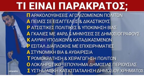 Τελικά ποιο και τι είναι το παρακράτος; Ας δούμε την απάντηση που δίνει το jodi.graphics, και με ένα βίντεο Παρακολουθήσεις αγωνιζόμενων πολιτώνΑπειλές σε εισαγγελείς & δικαστικούςΡατσιστικές πολιτικές & υποκίνηση βίαςΑγκαλιές με ΜΜΕ & #ΑΡΔ και μηνύσεις σε δημοσιογράφουςΚάλυψη υποδίκων & καταδικασμένωνΡεσιτάλ διαπλοκής με επιχειρηματίεςΑστυνομική βία & αυθαιρεσίαΤρομοκράτηση & χειραγώγηση πολιτώνΟλοκληρωτικό ξεπούλημα δημόσιας περιουσίαςΣυστηματική κατασπατάληση δημοσίου χρήματος