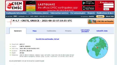 Σεισμό 4,7 Ρίχτερ κατέγραψε στα νότια του νομού Ηρακλείου το Ευρωμεσογειακό Σεισμολογικό Ινστιτούτο. Ο σεισμός σημειώθηκε στις 10:19 το πρωί με εστιακό βάθος 30 χιλιομέτρων. Magnitude mb 4.7 Region CRETE, GREECE Date time 2021-08-23 07:19:35.0 UTC Location 34.19 N ; 26.15 E Depth 30 km Distances 156 km SE of Irákleion, Greece / pop: 137,000 / local time: 10:19:35.0 2021-08-2399…
