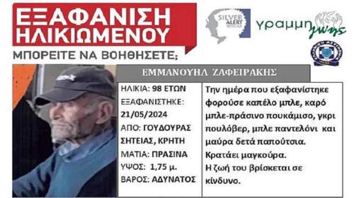 Νεκρός, σχεδόν 3 μήνες μετά την εξαφάνισή του, βρέθηκε ένας 98χρονος Κρητικός τα ίχνη του οποίου είχαν χαθεί από τον περασμένο Μάιο. Δείτε: Συναγερμός για την εξαφάνιση ηλικιωμένου Κρητικού Ο ηλικιωμένος βρέθηκε νεκρός σε ορεινή περιοχή στη Σητεία. Οι πρώτες ενδείξεις φανερώνουν ότι μάλλον ο θάνατός του οφείλεται σε παθολογικά αίτια. Σημειώνεται ότι ο 98χρονος είχε εξαφανιστεί πριν τρεις μήνες…