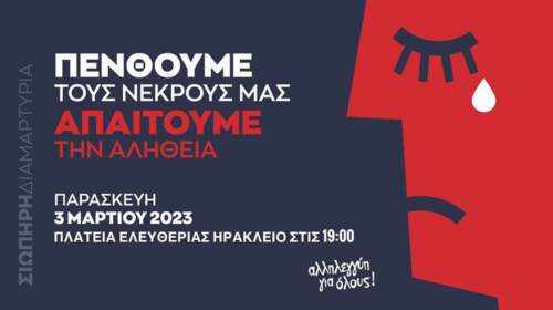 «Πενθούμε τους νεκρούς μας, απαιτούμε την αλήθεια» Σιωπηρή διαμαρτυρία θα πραγματοποιηθεί την Παρασκευή στο Ηράκλειο για την τραγωδία στα Τέμπη. H συγκέντρωση θα πραγματοποιηθεί στις 19.00 στην πλατεία Ελευθερίας. Κάλεσμα από την ΑΔΕΔΥ Ηρακλείου Το Νομαρχιακό Τμήμα Α.Δ.Ε.Δ.Υ. Ηρακλείου συμμετέχει στη σιωπηρή διαμαρτυρία σωματείων και φορέων, που διοργανώνεται την Παρασκευή 3 Μαρτίου στις 19:00 μμ στην Πλατεία Ελευθερίας εκφράζοντας τη…