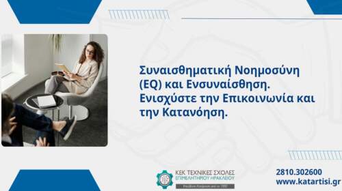 Έναρξη 18/06/2024 Ένα νέο σεμινάριο για όσους θέλουν να καλλιεργήσουν δεξιότητες συναισθηματικής νοημοσύνης και ενσυναίσθησης για να βελτιώσουν την καθημερινότητα τους σε επαγγελματικό και προσωπικό επίπεδο διοργανώνει το ΚΕΚ Τεχνικές Σχολές Επιμελητηρίου Ηρακλείου. Το εκπαιδευτικό αυτό πρόγραμμα δεν απαιτεί προηγούμενες γνώσεις στο αντικείμενο και παρέχει σε κάθε ενδιαφερόμενο τη δυνατότητα ν΄ αναπτύξει μια βαθύτερη κατανόηση της αξίας της συναισθηματικής νοημοσύνης…