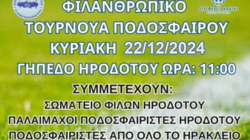 Στο δημοτικό στάδιο Νέας Αλικαρνασσού Το «Σωματείο Φίλων Ηροδότου εις μνήμην Αντωνίου Καργιωτάκη»,πραγματοποιεί φιλανθρωπικό τουρνουά ποδοσφαίρου για την στήριξη ευπαθών κοινωνικά οικογενειών. Το τουρνουά θα γίνει την Κυριακή 22 Δεκεμβρίου και ώρα 11 το πρωί στο δημοτικό στάδιο Ν. Αλικαρνασσού. Θα συμμετέχουν 4 ομάδες βετεράνων ποδοσφαιριστών του Ηρακλείου. Η είσοδος θα είναι ελεύθερη. Η εκδήλωση στηρίζεται από την Περιφέρεια Κρήτης.