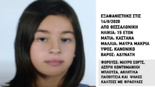 Στις 14/8/2020 και ώρα 19:00, εξαφανίστηκε από την Θεσσαλονίκη η Κωνσταντίνα Σωτηροπούλου, 15 ετών. Το «Χαμόγελο του Παιδιού» ενημερώθηκε για την εξαφάνιση της ανήλικης Κωνσταντίνας Σωτηροπούλου, στις 15/8/2020 και προχώρησε άμεσα στην ενεργοποίηση του μηχανισμού AMBER ALERT HELLAS, καθώς συντρέχουν λόγοι οι οποίοι θέτουν την υγεία της σε κίνδυνο. Η Κωνσταντίνα έχει μαύρα μακριά μαλλιά και καστανά μάτια, κανονικό ύψος…