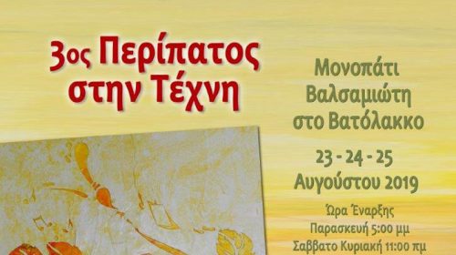 Τριήμερο εκδηλώσεων στο μονοπάτι του Βαλσαμιώτη στο Βατόλακκο Ο Πολιτιστικός Σύλλογος Βατολάκκου «ΑΝΑΓΕΝΝΗΣΗ» με τον Δήμο Πλατανιά και την στήριξη της Περιφέρειας Κρήτης διοργανώνει τον 3ο «ΠΕΡΙΠΑΤΟ ΣΤΗΝ ΤΕΧΝΗ» Στις 23, 24 και 25 Αυγούστου του 2019 σαράντα Έλληνες και ξένοι καλλιτέχνες θα συναντηθούν στο Βατόλακκο στο ιστορικό μονοπάτι κάτω απ’ τη σκιά των δέντρων δίπλα στο ποτάμι . Αν κάνετε…
