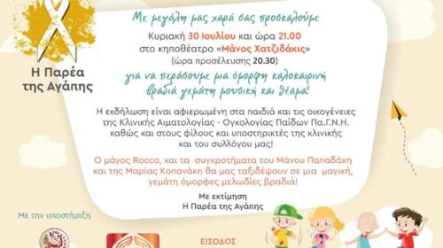Στο Κηποθέατρο «Ν. Καζαντζάκης» την Κυριακή 30 Ιουλίου στις 21:30 με ελεύθερη είσοδο Ο μάγος Rocco, ο μουσικός Μάνος Παπαδάκης με το συγκρότημά του και η μουσικός Μαρία Κοπανάκη θα ψυχαγωγήσουν τα παιδιά και τις οικογένειές τους δίνοντας μια νότα χαράς και αισιοδοξίας και βοηθώντας με αυτόν τον τρόπο στον δύσκολο αγώνα που δίνουν καθημερινά. Οι μικροί μας φίλοι από την …