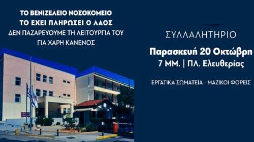 Νέο συλλαλητήριο θα πραγματοποιηθεί σήμερα Παρασκευή 20 Οκτωβρίου ενάντια στην υποβάθμιση του Βενιζελείου. Το συλλαλητήριο θα πραγματοποιηθεί στην πλατεία Ελευθερίας στις 7 το απόγευμα. Δείτε επίσης: «Δεν θα επιτρέψουμε σε κανέναν να παίζει με την υγεία μας»: Νέο συλλαλητήριο την Παρασκευή για το Βενιζέλειο Το συλλαλητήριο συνδιοργανώνουν: Εργατικό Κέντρο Ηρακλείου Ένωση Γιατρών Ηρακλείου Σύνδεσμος Κοινωνικών Λειτουργών Ελλάδας ΝΠΔΔ- Περιφερειακό Τμήμα…