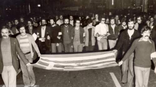 Φωτο εξωφύλλου: Στιγμιότυπο από τη μεγαλειώδη πορεία στη δεύτερη επέτειο (1975) της εξέγερσης του Πολυτεχνείου. Στην κεφαλή της πορείας τα μέλη του προεδρείου της Εθνικής Φοιτητικής Ένωσης Ελλάδας, κρατώντας την αιματοβαμμένη σημαία. Μπροστά ο τότε κνίτης πρόεδρος της ΕΦΕΕ Γιώργος Σταματάκης (δεξιά) με τον πασόκο γεν. γραμματέα Στέφανο Τζουμάκα και πίσω (δεξιά) ο τότε Ρηγάς αντιπρόεδρος Χρύσανθος Λαζαρίδης – χρόνια…