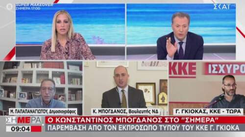 Χαμός στον αέρα του ΣΚΑΙ μεταξύ του Κωνσταντίνου Μπογδάνου και του εκπροσώπου Τύπου, ΚΚΕ, Γιάννη Γκιόκα. Το πρωί της Πέμπτης, η εκπομπή «Σήμερα» του ΣΚΑΪ είχε καλεσμένο τον βουλευτή Κωνσταντίνο Μπογδάνο με αφορμή την επίθεση με γκαζάκια έξω από το σπίτι του, το βράδυ της Τρίτης. Δείτε: Εμπρηστική επίθεση στο αυτοκίνητο και το σπίτι του Κ. Μπογδάνου Ο εκπρόσωπος Τύπου…
