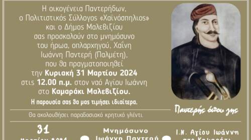 Τη μνήμη του Καπετάν Ιωάννη Παλμέτη – Παντερή θα τιμήσουν ο Δήμος Μαλεβιζίου, ο Πολιτιστικός Σύλλογος Καμαρακίου «Ο Χαϊνόσπηλιος» και η οικογένεια των Παντερήδων την Κυριακή 31 Μαρτίου, στις 12.00 με μνημόσυνο που θα τελεστεί στον Ιερό Ναό του Αγίου Ιωάννη στο Καμαράκι. Ο οπλαρχηγός Ιωάννης Παλμέτης – Παντερής αποτέλεσε μία θρυλική μορφή κατά την περίοδο των Κρητικών Επαναστάσεων ενάντια…