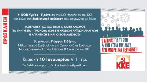 Η ΚΟ Υγείας – Πρόνοιας της ΚΟ Ηρακλείου του ΚΚΕ διοργανώνει αύριο Κυριακή 10 Γενάρη, στις 11πμ διαδικτυακή συζήτηση με τίτλο «Αθεράπευτος ιός είναι ο καπιταλισμός – Για την Υγεία – Πρόνοια των σύγχρονων λαϊκών αναγκών η απάντηση είναι ο Σοσιαλισμός». Θα μιλήσει ο Γιώργος Σιδέρης, μέλος του Γενικού Συμβουλίου της Ομοσπονδίας Ενώσεων Νοσοκομειακών Γιατρών Ελλάδας (ΟΕΝΓΕ) και στέλεχος του…
