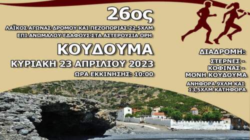 Αντίστροφη μέτρηση για τον 26ο Αγώνα Ανώμαλου Δρόμου και Πεζοπορίας Κουδουμά, που θα διεξαχθεί την Κυριακή 23 Απριλίου 2023 (ώρα εκκίνησης: 10:00), δίνοντας την ευκαιρία σε δρομείς και πεζοπόρους από κάθε γωνιά της χώρας και από το εξωτερικό να… δοκιμάσουν τις δυνάμεις τους σε μια ορεινή διαδρομή 22,5 χιλιομέτρων, σε ένα φυσικό τοπίο μοναδικής ομορφιάς. Τον αγώνα συνδιοργανώνουν ο Δήμος…