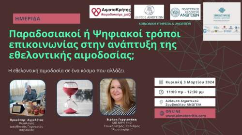 Ημερίδα με τίτλο “Η εθελοντική αιμοδοσία σε ένα κόσμο που αλλάζει: παραδοσιακοί ή οι ψηφιακοί τρόποι επικοινωνίας; ” θα πραγματοποιηθεί την Κυριακή 3 Μαρτίου 2024 στα Ανώγεια (αίθουσα Δημοτικού Συμβουλίου Δ. Ανωγείων) και ώρες 11:00-12:30μμ με δυνατότητα διαδυκτιακής παραλολούθησης. Θα παρουσιαστούν επίσης τα αποτελέσματα από την πιλοτική φάση των 25 διαδυκτιακών αιμοΔΟΤΙΚΩΝ διαδυκτιακών συναντήσεων (webinars) και αποτελέσματα από τη βιβλιογραφία και την εμπειρία…
