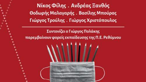Τετάρτη 12 Μάη στις 7 μμ Η Νομαρχιακή Επιτροπή Ρεθύμνου του ΣΥΡΙΖΑ-Προοδευτική Συμμαχία διοργανώνει την Τετάρτη 12 Μάη στις 19.00 διαδικτυακή εκδήλωση με θέμα «Εκπαίδευση και Πανδημία: Συνέπειες, προκλήσεις, προοπτικές» στo πλαίσιο της διαβούλευσης των προγραμματικών θέσεων του κόμματος με φορείς και συλλογικότητες της Π.Ε. Ρεθύμνου. Την εισήγηση των προγραμματικών θέσεων θα κάνουν οι: Νίκος Φίλης, Βουλευτής και Τομεάρχης Παιδείας…