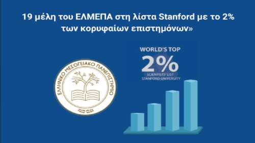 Σημαντική διεθνή διάκριση απέσπασαν δεκαεννέα (19) μέλη ΔΕΠ του Ελληνικού Μεσογειακού Πανεπιστημίου (ΕΛΜΕΠΑ), καθώς συγκαταλέγονται στο κορυφαίο 2% των πιο επιδραστικών επιστημόνων παγκοσμίως, σύμφωνα με την ετήσια κατάταξη του Πανεπιστημίου Stanford, η οποία δημοσιεύεται στο Elsevier Data Repository. Η κατάταξη αυτή που θεωρείται μία από τις πιο αξιόπιστες και αναγνωρισμένες διεθνώς, περιλαμβάνονται οι κορυφαίοι 100.000 επιστήμονες παγκοσμίως, και βασίζεται σε αυστηρά κριτήρια όπως…
