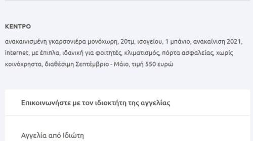 Κάπου έχει ξεφύγει το όλο θέμα των ενοικίων στο Ηράκλειο, αφού κάποιοι αποφάσισαν να πουλήσουν… χρυσάφι την όποια ιδιοκτησία τους. Δείτε, για παράδειγμα, την αγγελία που έβαλε ιδιοκτήτης γκαρσονιέρας στο κέντρο του Ηρακλείου Δείτε την σχετική αναφορά Ηρακλειώτη πολίτη: