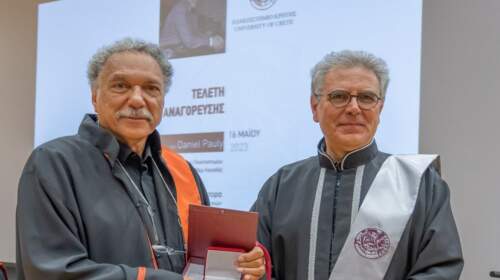 Την Τρίτη 16 Μαΐου 2023 και ώρα 13:00 στο Αμφιθέατρο «Νίκος Πετρίδης» του Τμήματος Μαθηματικών και Εφαρμοσμένων Μαθηματικών του Πανεπιστημίου Κρήτης πραγματοποιήθηκε η Τελετή Αναγόρευσης σε Επίτιμο Διδάκτορα του Τμήματος Βιολογίας, της Σχολής Θετικών και Τεχνολογικών Επιστημών του Πανεπιστημίου Κρήτης του Καθηγητή Αλιευτικής Βιολογίας του Πανεπιστημίου της Βρετανικής Κολομβίας, Βανκούβερ Καναδάς Daniel Pauly. Η τελετή ξεκίνησε με προσφωνήσεις του Αντιπρύτανη…