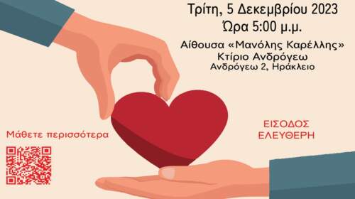 Στο πλαίσιο των εκδηλώσεων του Δήμου Ηρακλείου /Αντιδημαρχίας Εθελοντισμού για την Παγκόσμια Ημέρα Εθελοντισμού., την Τρίτη 5 Δεκεμβρίου (17:00) στο Κτίριο Ανδρόγεω (αίθουσα «Μανόλης Καρέλλης»), θα πραγματοποιηθεί η εσπερίδα με θέμα: «Όταν ο πόνος γίνεται ελπίδα… και το σκοτάδι, φως!».   Στην εκδήλωση θα παρουσιάσουν το έργο τους ο Παγκρήτιος Σύλλογος Γονέων και Φίλων Παιδιών με Νεοπλασία «Ηλιαχτίδα» και ο Παγκρήτιος…