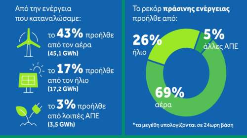 Νέο ρεκόρ καθαρής ενέργειας κατέγραψε η χώρα μας την Κυριακή 9 Μαΐου με τις ΑΠΕ να καλύπτουν το 63% της συνολικής ζήτησης (65,9 GWh/104,1GWh). Από την ενέργεια που καταναλώθηκε εκείνη την ημέρα, ο άνεμος «πρωταγωνίστησε» με 43%, ο ήλιος συνεισέφερε 17% και οι λοιπές ΑΠΕ (υδροηλεκτρικά, βιoαέριο-βιομάζα, ΣΗΘΥΑ) το υπολειπόμενο 3%. Η νέα ιστορική επίδοση της χώρας κατέρριψε το προηγούμενο…