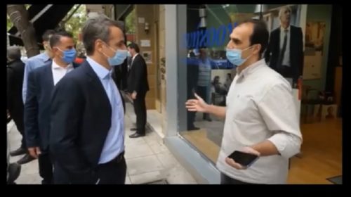 Απλή ανόθευτη λογοκρισία “χτύπησε” το βίντεο από την επίσκεψη του Κυριάκου Μητσοτάκη στο Παγκράτι χθες Πέμπτη που ανέβηκε στο λογαριασμό του πρωθυπουργού στα social media. Στη διάρκεια της επίσκεψης, εκτός από το να ακουμπά τη μάσκα του και να την κατεβάζει στο πηγούνι, ο Κυριάκος Μητσοτάκης αντάλλαξε αγκωνιές και φιλοφρονήσεις με πολίτες και καταστηματάρχες. Ωστόσο βρέθηκε και κάποιος που τόλμησε…