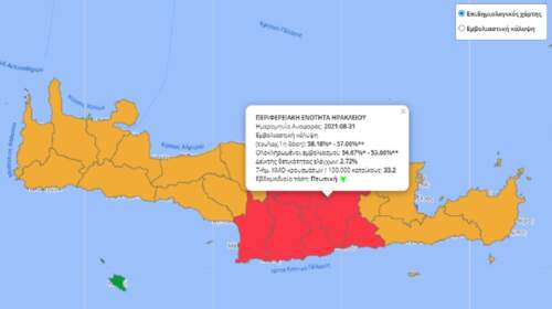 Με βάση τα επιδημιολογικά στοιχεία των τελευταίων επτά ημερών, την Τρίτη 31 Αυγούστου κατά την επικαιροποίηση του επιδημιολογικού χάρτη της χώρας, που αναρτάται στο covid19.gov.gr, υπήρξε τροποποίηση του χάρτη σε ότι αφορά στις περιφερειακές ενότητες της Κρήτης. Έτσι οι Π.Ε. Χανίων και Ρεθύμνης, από το «κόκκινο» πέρασαν στο «κίτρινο», ενώ μόνο η Π.Ε. Ηρακλείου έμεινε στο «κόκκινο». ΠΕΡΙΦΕΡΕΙΑΚΗ ΕΝΟΤΗΤΑ ΗΡΑΚΛΕΙΟΥΗμερομηνία…