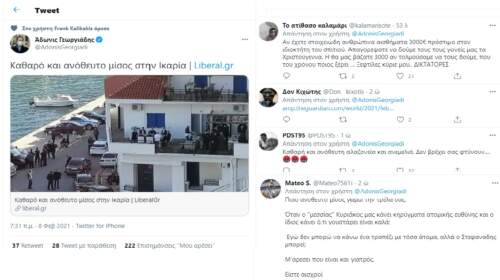 Την “έκανε” πάλι ο μέγας Άδωνης Γεωργιάδης! Την οργή ολόκληρης της κοινωνίας για τα νέα καμώματα Μητσοτάκη στην Ικαρία και το κορονογεύμα, την “ερμηνεύει” ως… “καθαρό και ανόθευτο μίσος στην Ικαρία”, με σημερινό tweet του. Βέβαια στην πραγματικότητα κάνει αναπαραγωγή άρθρου του μεγάλου Μαυρίδη από το liberal.gr… Καταλαβαίνετε βέβαια τι έγινε στη συνέχεια. Πάρτε απλά μια ιδέα! Και βέβαια τρώει……