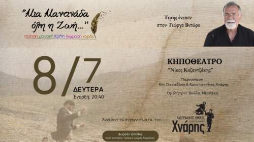 Ο λαογραφικός όμιλος Λάζαρος και Μανόλης Χνάρης, σας προσκαλεί, σε μία εκδήλωση -αφιέρωμα στην Κρητική μαντινάδα ! Με τιμητική αναφορά στο έργο του σπουδαίου Θεματοφύλακα της Κρητικής παράδοσης και της μαντινάδας Γιώργο Βιτώρο ! Ομιλήτρια η γνωστή τηλεοπτική παραγωγός Βούλα Νεονάκη! Παίζουν και τραγουδούν τα σπουδαία μουσικά συγκροτήματα των: Φασουλά – Καλλέργη Αντώνη Μαρτσάκη και Τζουλιαδάκη-Καρατζη Χορεύουν τα χορευτικά συγκροτήματα…